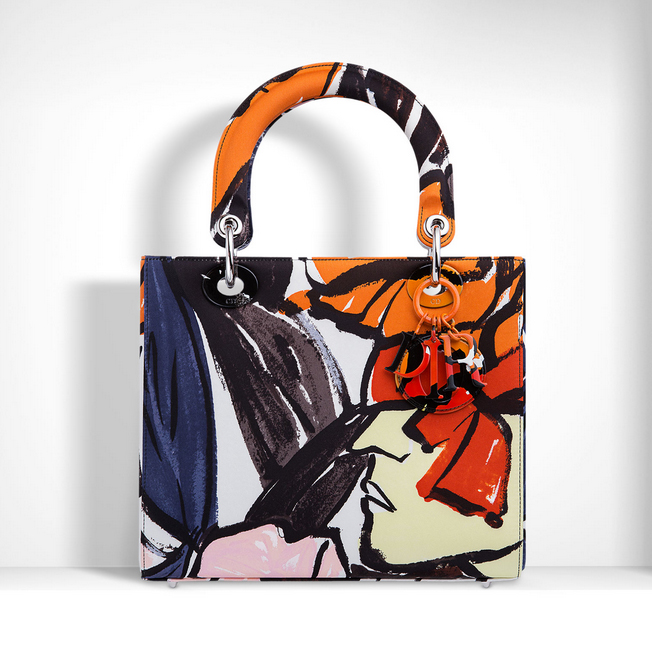 A timeless and unique work of art, the "Lady Dior" bag is imbued with the Couture spirit of Dior. Echoing the emblematic silk scarves of the 2015 Cruise Ready-To-Wear show in Brooklyn, this exclusive version in printed twill mixes American pop iconography with the floral motifs favoured by the House of Dior. The bag can be carried by hand or worn on the shoulder for unrivalled elegance. Full of colour, it accessories with silver-tone jewellery and charms meticulously painted by hand.