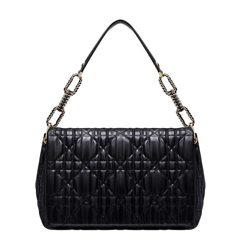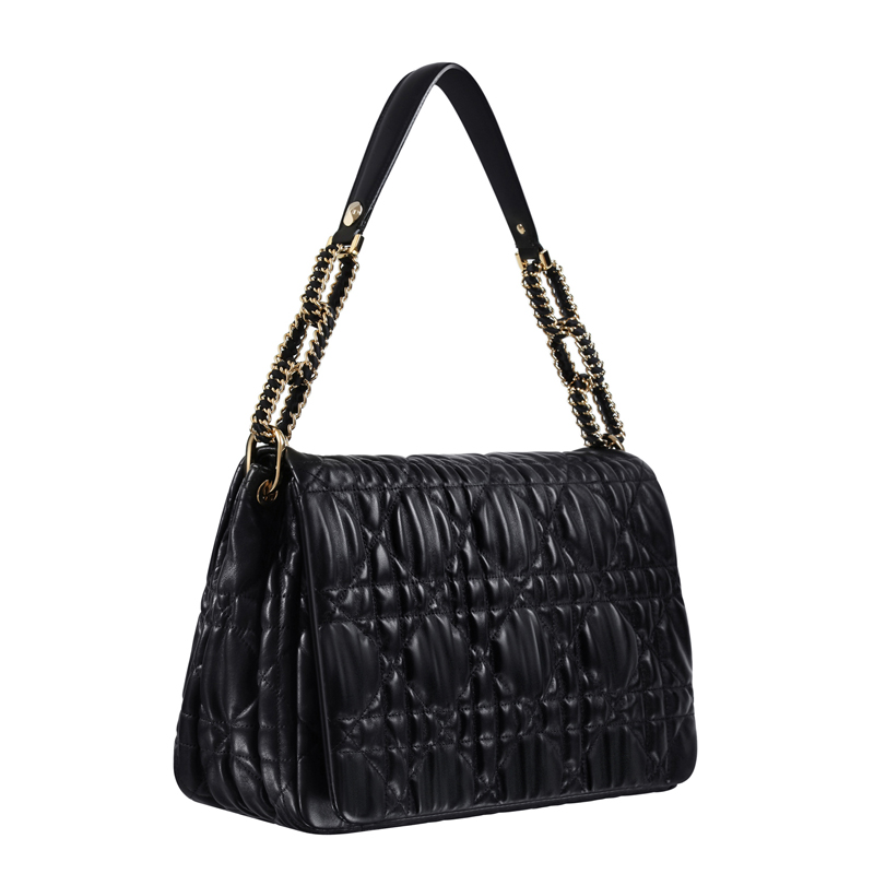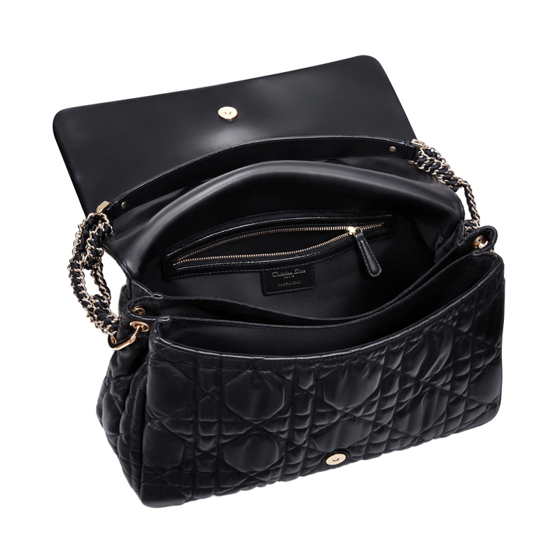 This black leather flap bag features soft rounded lines and embossed 'Cannage' stitching.
