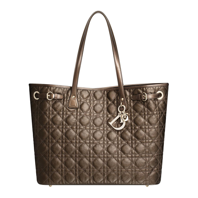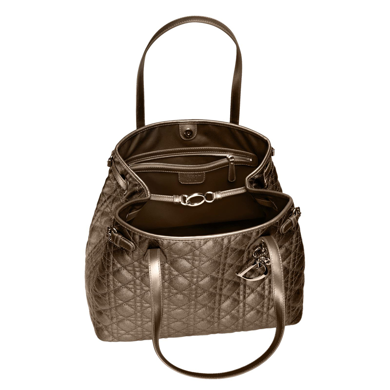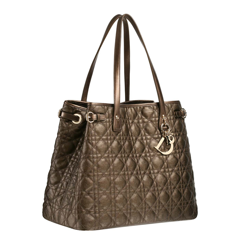 This large shopping bag in shiny bronze canvas is distinctive for its play of 'Cannage' stitching.