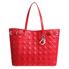 This large shopping bag in shiny geranium canvas features distinctive 'Cannage' stitching.