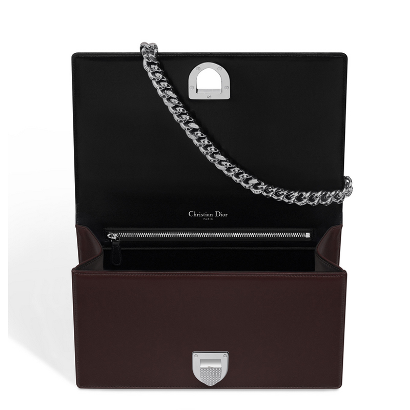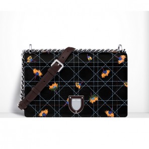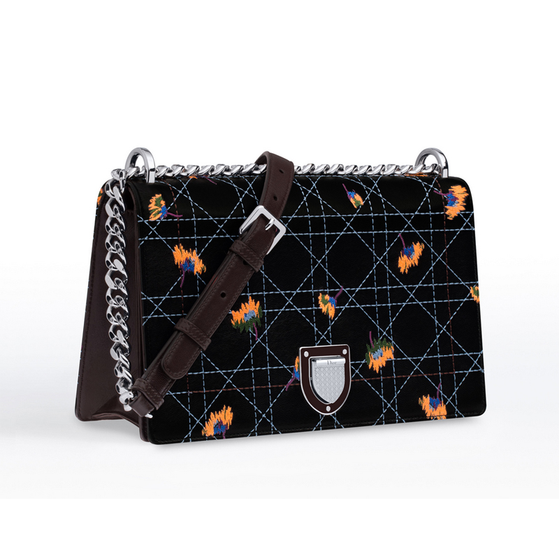 Fashionable and architectural, "Diorama" is the bag of the Spring-Summer 2015 show. This flap bag in black and brown lambskin makes a splash with its blue "Cannage" and orange embroidered flowers. Its crest-shaped clasp in silver-tone metal edged with chocolate-coloured enamel is the distinctive mark of the new Dior woman.