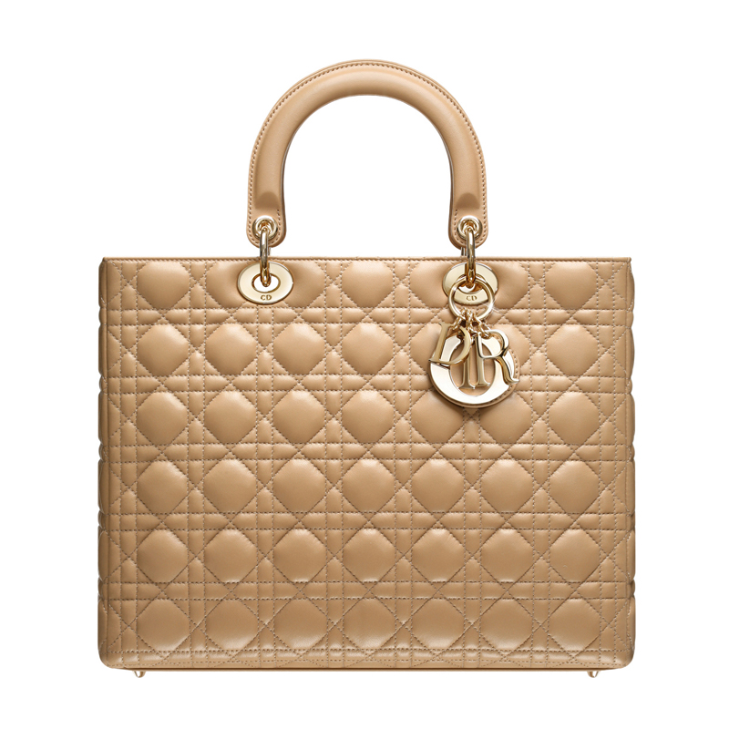 - This large bag in beige lambskin is distinguished by its Cannage stitching and its generous size. Its handle allows it to be worn on the wrist.