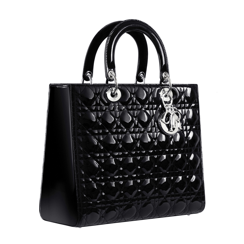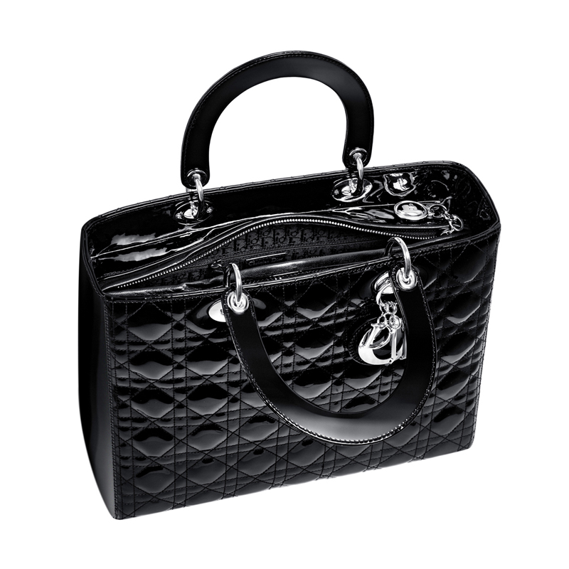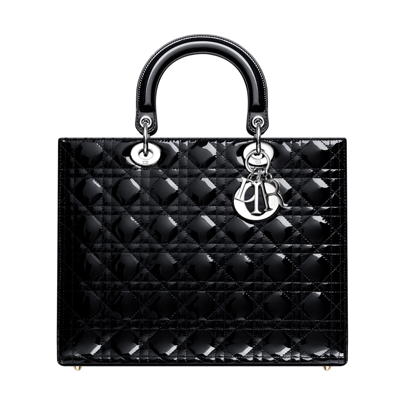 - In its new large bag format in black rounded patent leather and distinctive for its Dior signature 'Cannage' stitching.