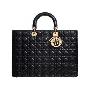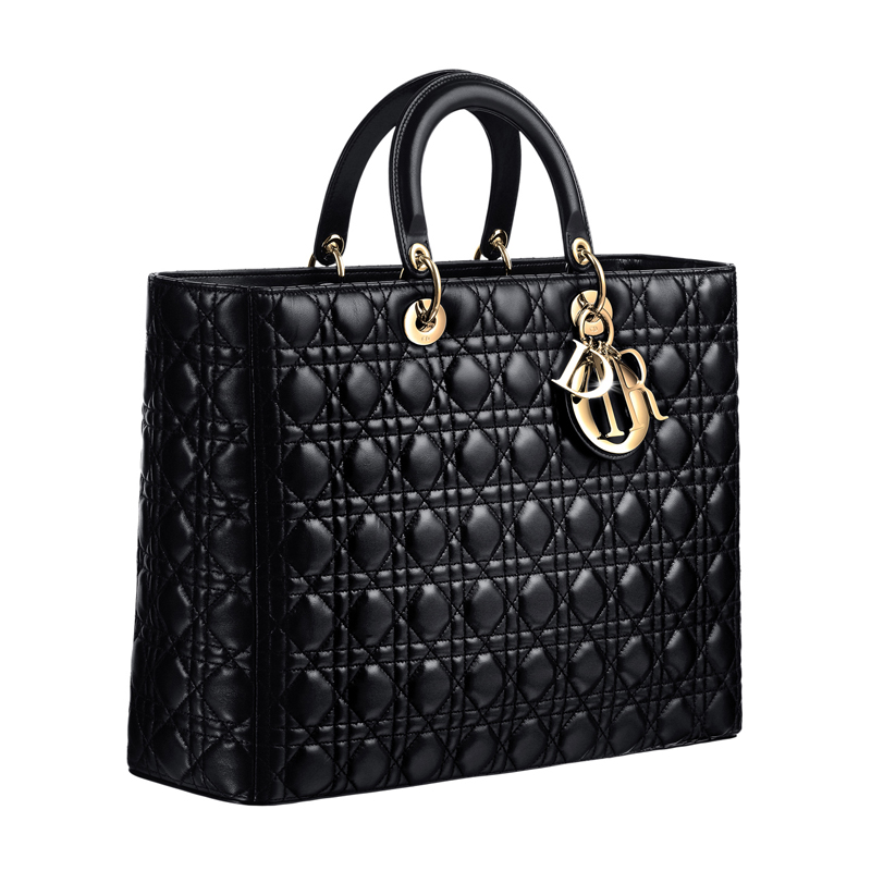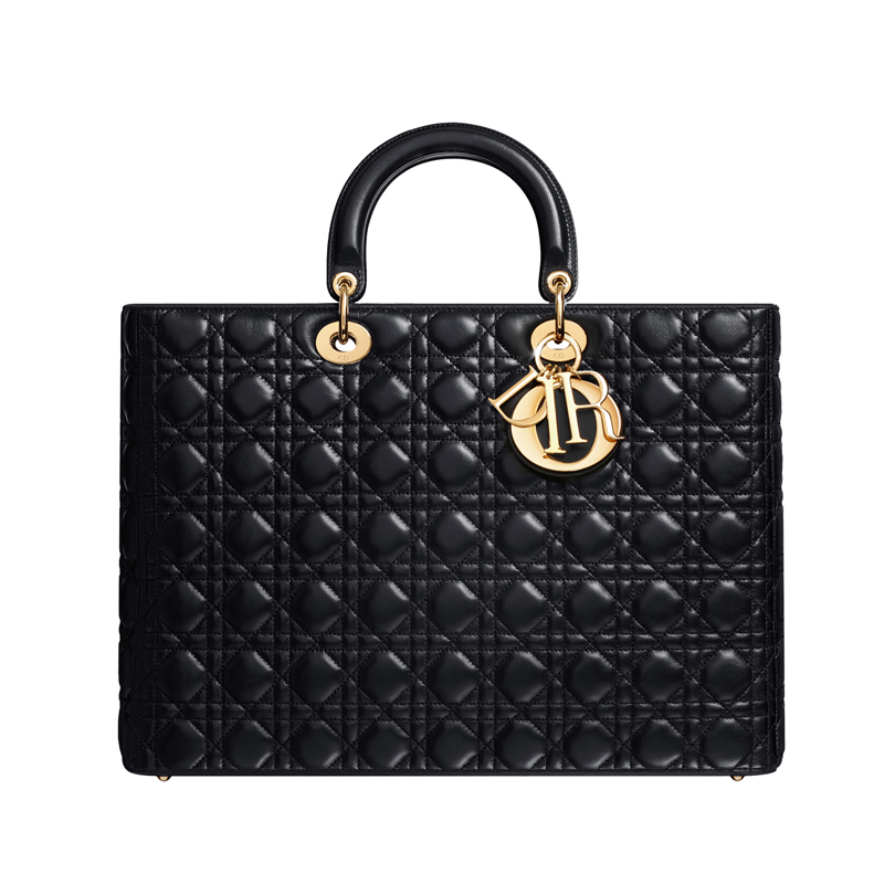 - This large and generous shopping bag in black leather is distinguished by its Cannage stitching. Its handle allows it to be worn on the wrist.
