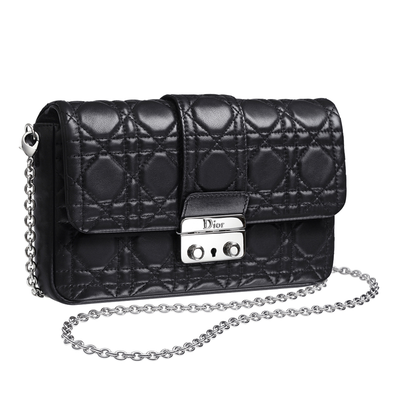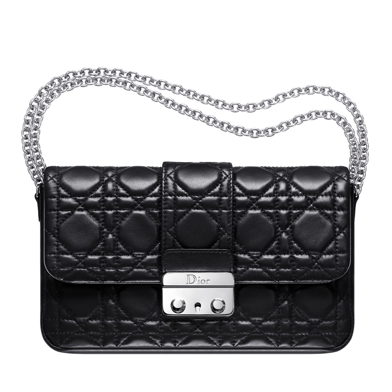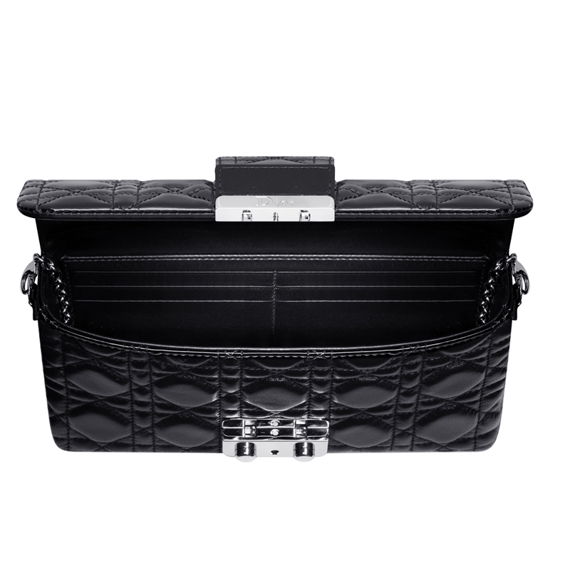 Inspired by the "New Look" created by Christian Dior in 1947, this large "promenade" pouch in black quilted leather and Cannage stitching sports a sophisticated and original clasp.
