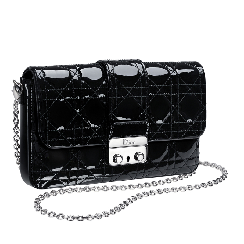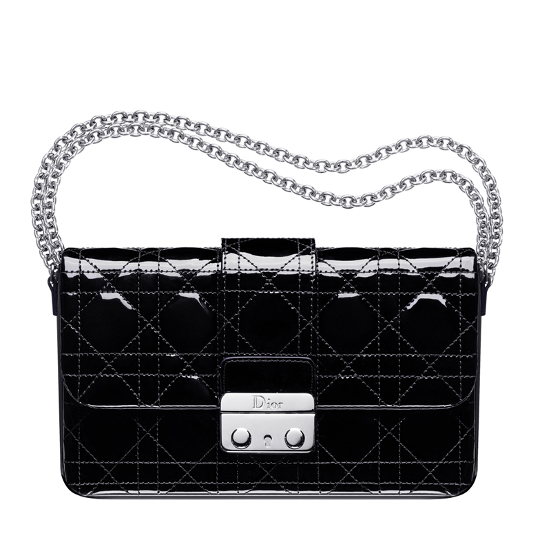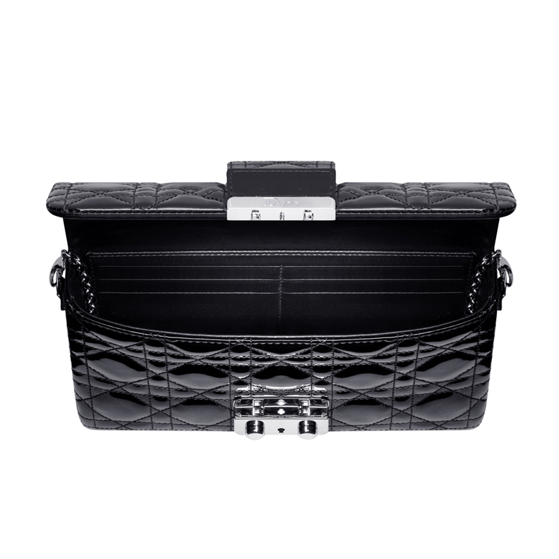 Inspired by the "New Look" created by Christian Dior in 1947,this large "promenade" pouch in black quilted patent leather and Cannage stitching sports a flap closure and a silver-tone metal clasp..