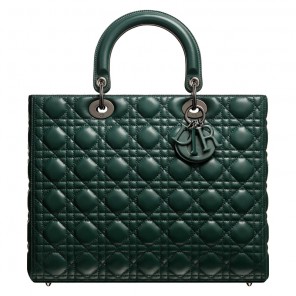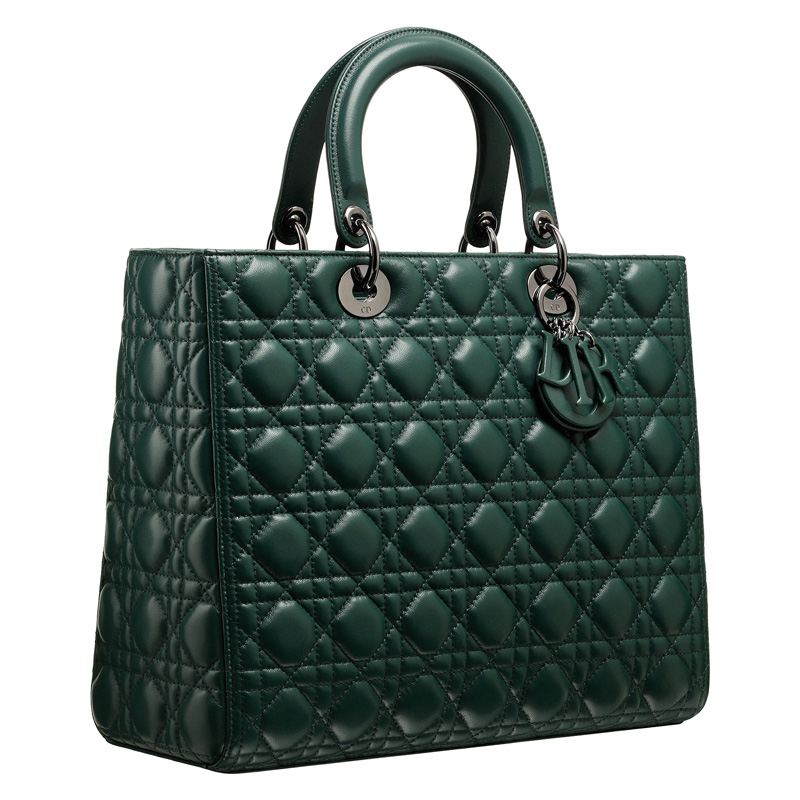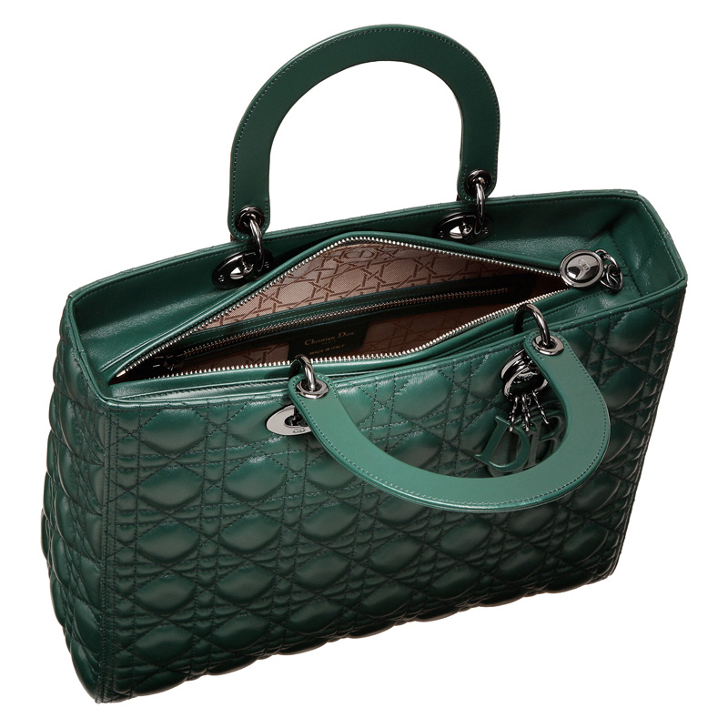 Meticulously hand-crafted, the Vert Anglais lambskin bag is enhanced by its tone on tone leather-covered "D.i.o.r" charms.
