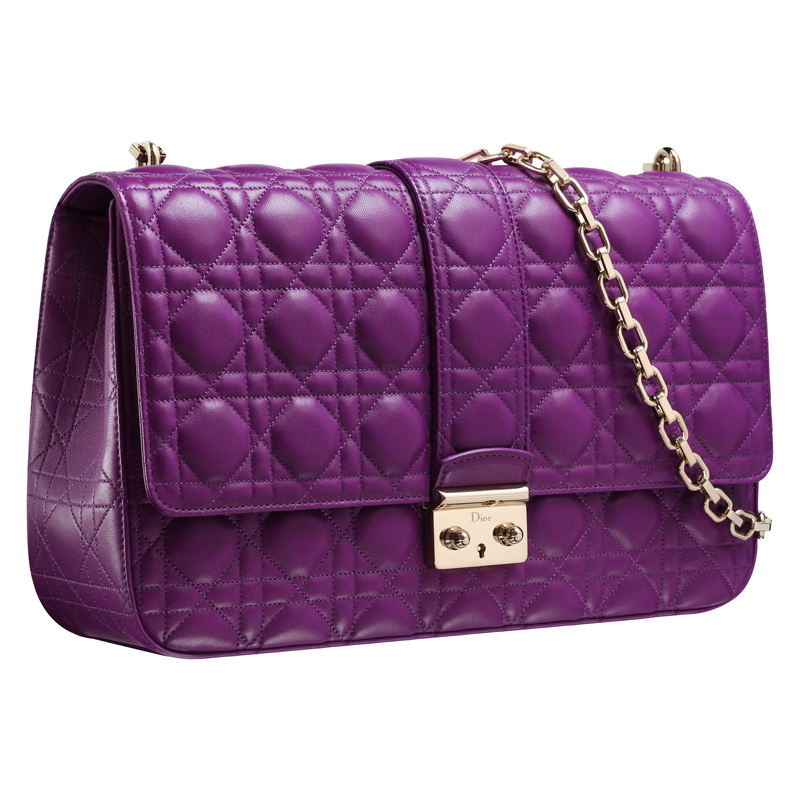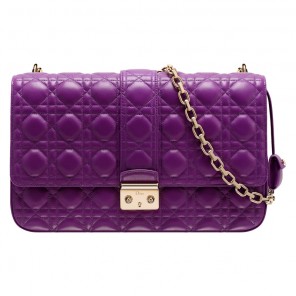 In purple lambskin, this bag is accessorised with a pale gold-tone metal chain allowing it to be carried elegantly on the shoulder. A key in its own leather case opens the double-push-button clasp.
