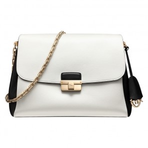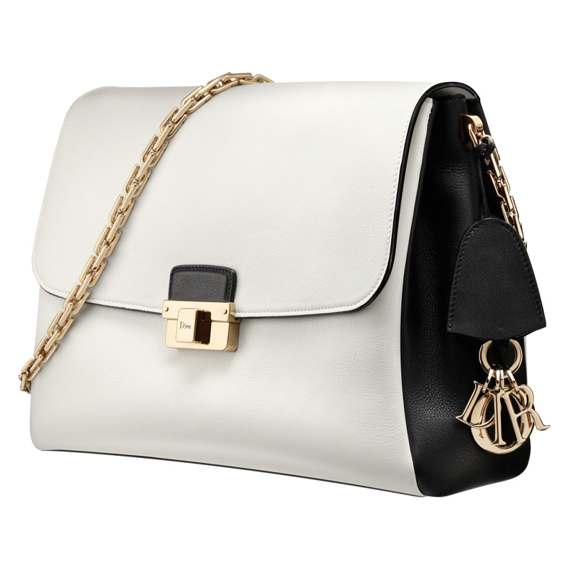 The suppleness of finely grained calfskin, the colour contrast, the clever magnetic clasp and feminine chain offer a chic, laid-back look.