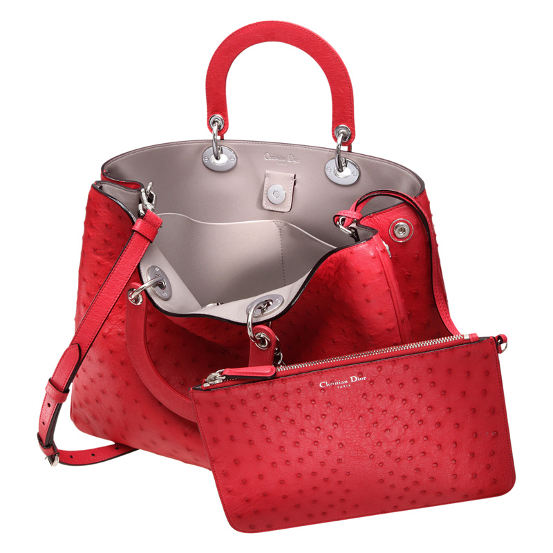 A true journey through the senses, an iconic line with timeless elegance that embodies all the craftsmanship of Dior. The exquisite ostrich leather, two handle options to carry in the hand or across the body, and the contrasting colours of the light coral outer and the mink-grey inner make the 'Diorissimo' bag a unique model.