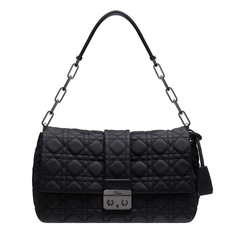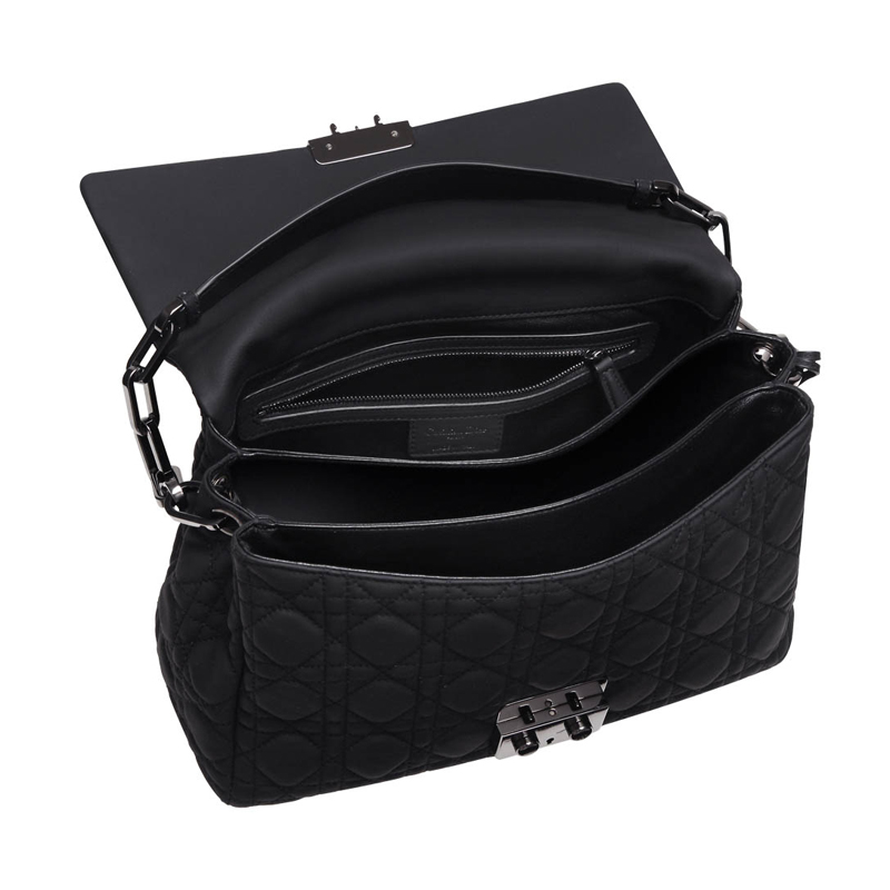 - This matt black quilted leather bag is distinguished by its 'Cannage' stitching and its black-silver double press-stud clasp.