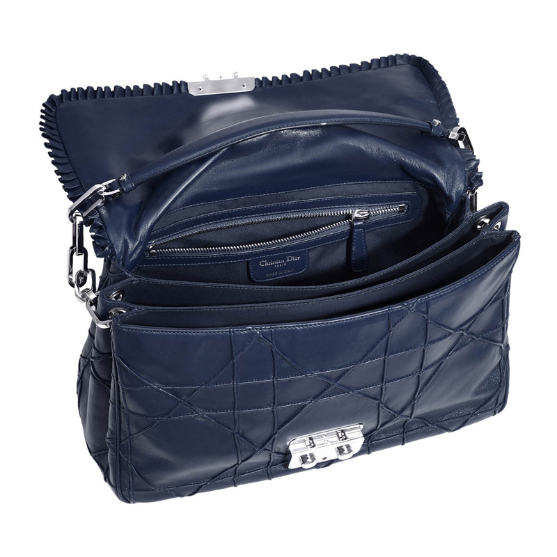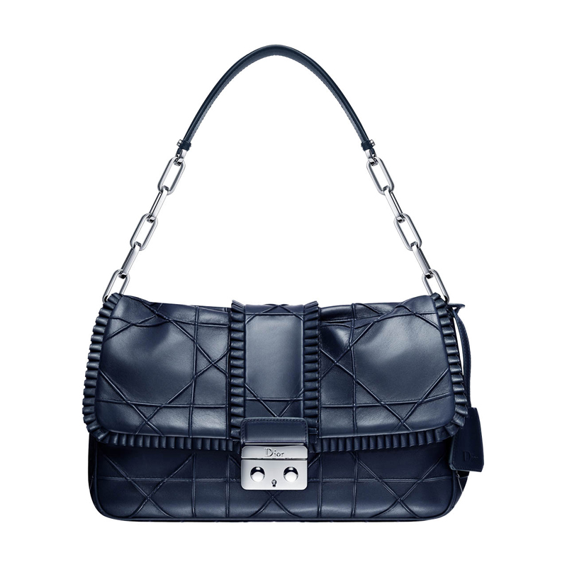 - This bag in navy-blue lambskin with flounced borders and "Cannage" stitching has a leather handle and a silver-tone metal chain.