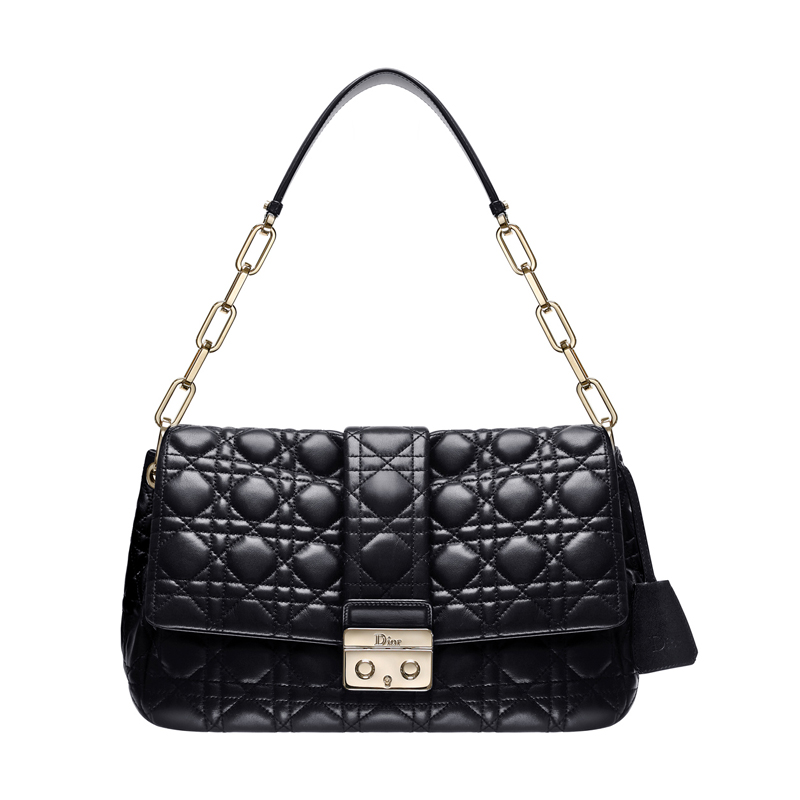 - This black lambskin bag with 'Cannage' stitching comes with leather handle and gold-tone metal chain.