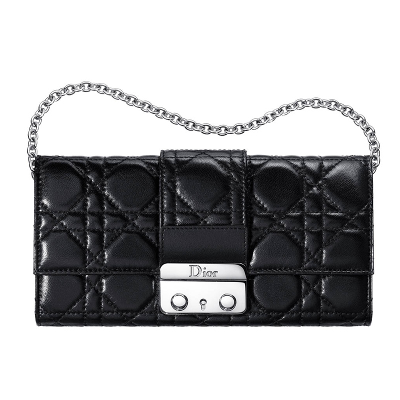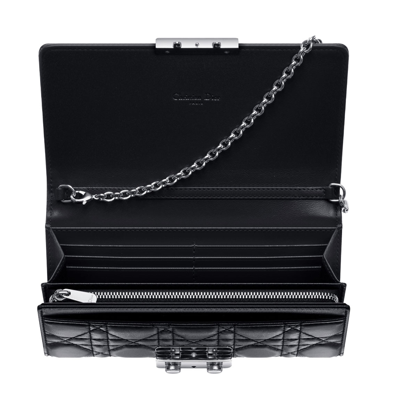 The range owes its name to the "New Look" invented by Christian Dior in 1947 with its sophisticated original clasp. This black leather "Rendez-vous" model wallet with 'Cannage' stitching comes with detachable silver-tone metal strap. Rectangular clasp with double button in silver-tone metal.