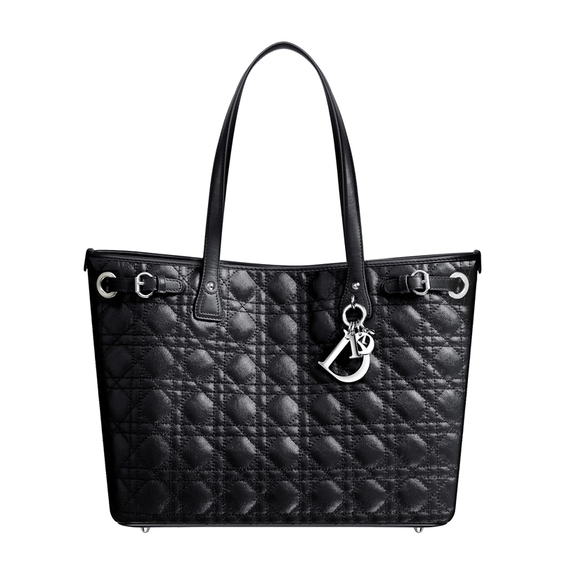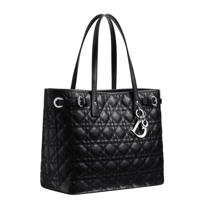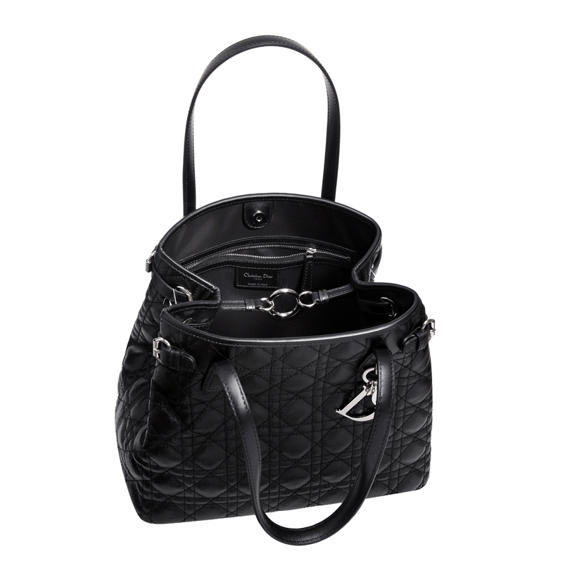 - This shiny black canvas bag is distinguished by its Cannage stitching. Practical and modern, its shape can be changed thanks to an inner clip system.