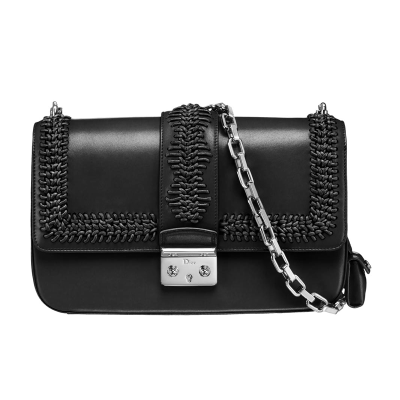 - The new, iconic 'Miss Dior' collection sets itself apart with its versatile, contemporary look. In shiny lack lambskin with a plaited flap, this bag is accessorised with a silver-tone metal chain allowing it to be carried elegantly on the shoulder. A key in its own leather case opens the double-push-button clasp.