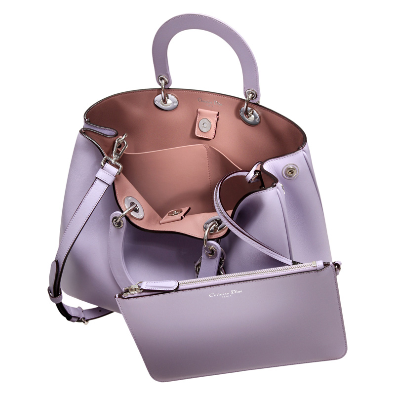 A true journey through the senses, an iconic line with timeless elegance that embodies all the craftsmanship of Dior. The exquisite leather, two handle options to carry in the hand or across the body, and the contrasting colours of the lilac outer and the dusky pink inner make the 'Diorissimo' bag a unique model.