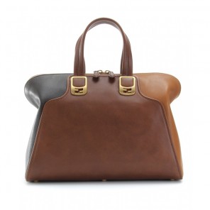 - Brown leather shoulder bag. Double top flat seamed handles.