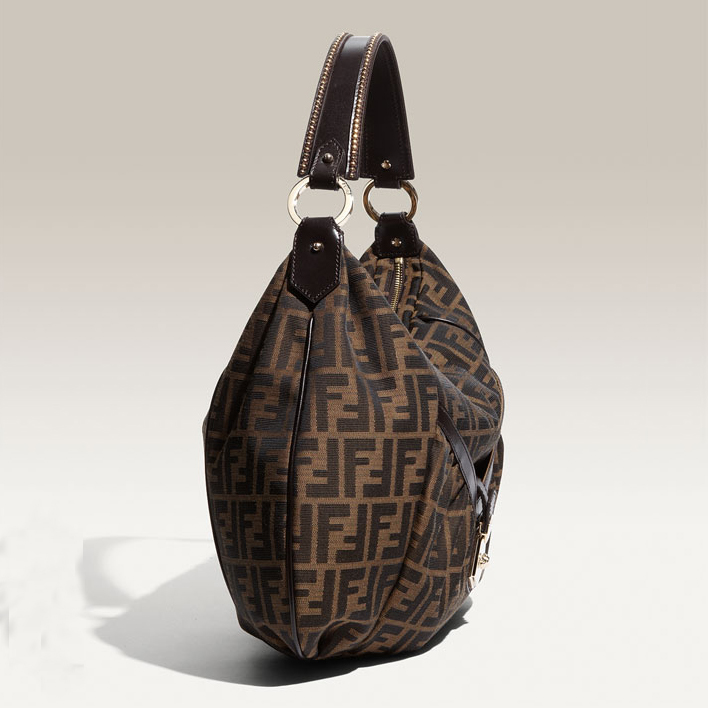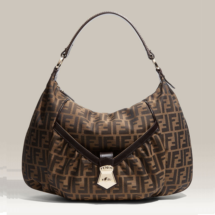 A goldtone logo padlock secures the curved front slip pocket of a logo-jacquard hobo topped with a single handle and trimmed with rich leather piping.