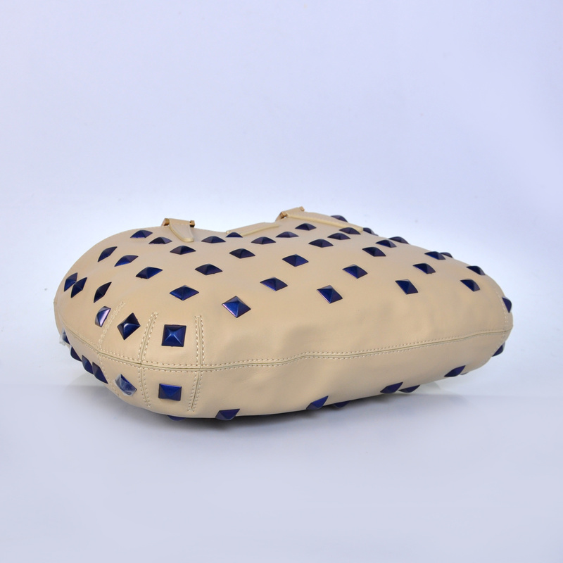 Colorful diamond-shaped studs adorn this versatile bag of smooth leather, complete with luxe canvas accents.