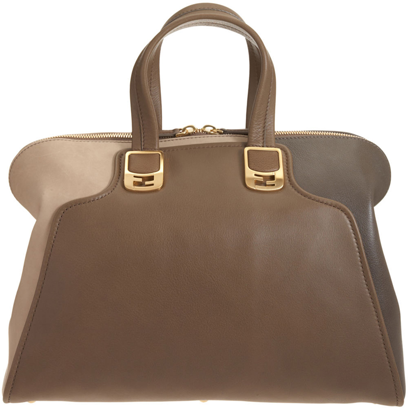 - Tri-color leather zip-top duffel bag with flat leather top handles, detachable shoulder strap, multi-textured leather patchwork detail and gold-tone hardware throughout. - Signature Fendi lined fabric interior with two slip compartments. Studs on bottom.