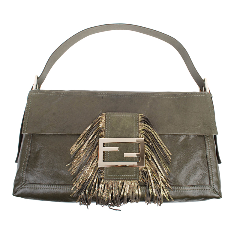 - Large leather shiny finish bag with front magnetic flap closure and tassle detail with metallic foil finish.
