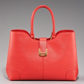 - Choose coral or black calfskin with tonal topstitching and golden hardware.