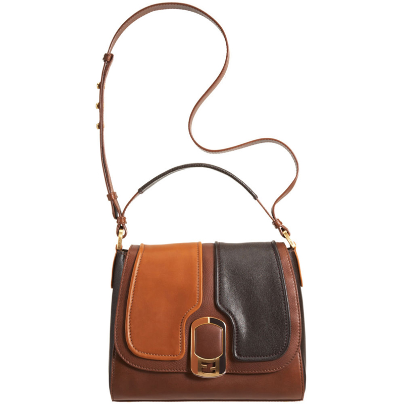 Smooth leather color block shoulder bag with magnetic close flap, enamel signature Zucca embellishment, leather top handle and adjustable shoulder strap. Sturdy, gold-tone signature stamped hardware throughout. Fabric-lined interior with one zip pocket.