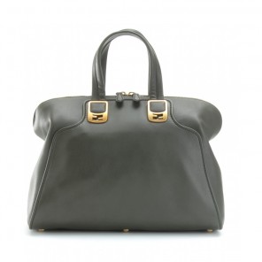 - Olive leather shoulder bag. Double top flat seamed handles.