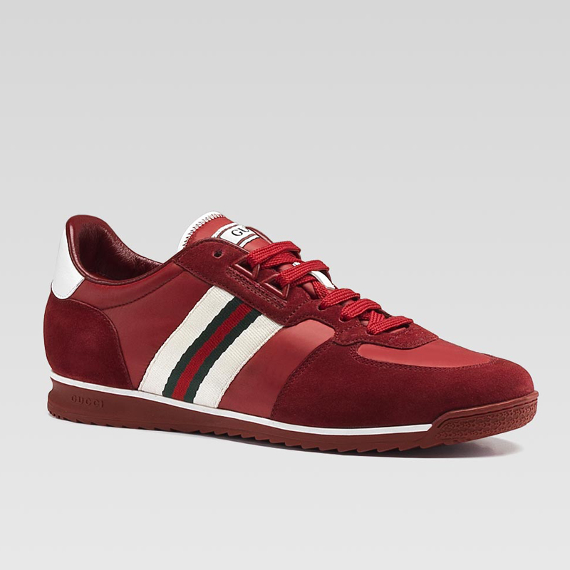 - red suede and nylon with green/red/green web and white and red leather trim