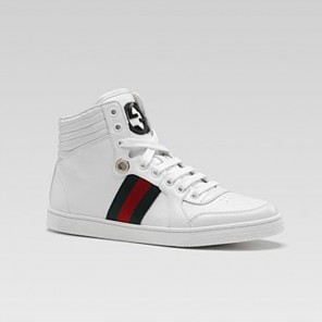 - white leather with green/red/green web and black rubber G - nickel hardware - rubber sole