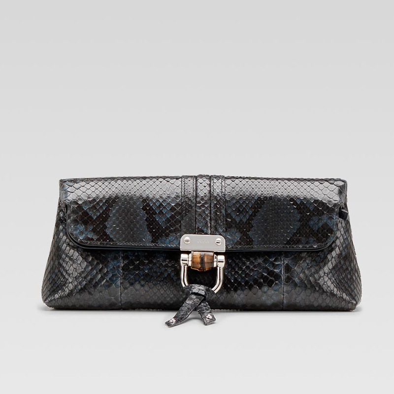 - dark blue shaded python - nickel hardware - flap and zipper closure - inside pocket
