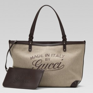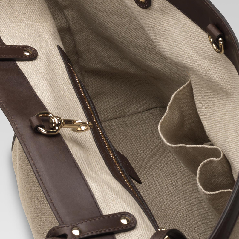 - beige linen with dark brown leather trim and vintage gucci trademark