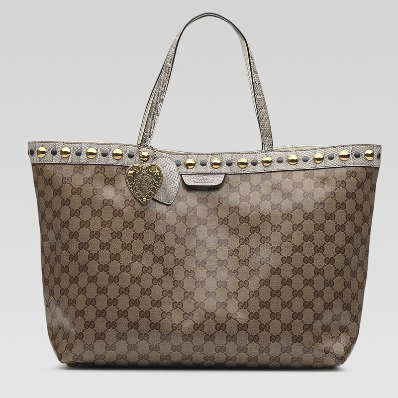 'gucci for UNICEF' special edition babouska large tote with heart-shaped gucci crest charm, gucci script logo, and studs. gucci will donate 25% of this sale to UNICEF from 1/15/09 through 1/31/10.