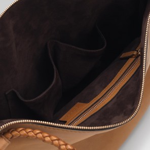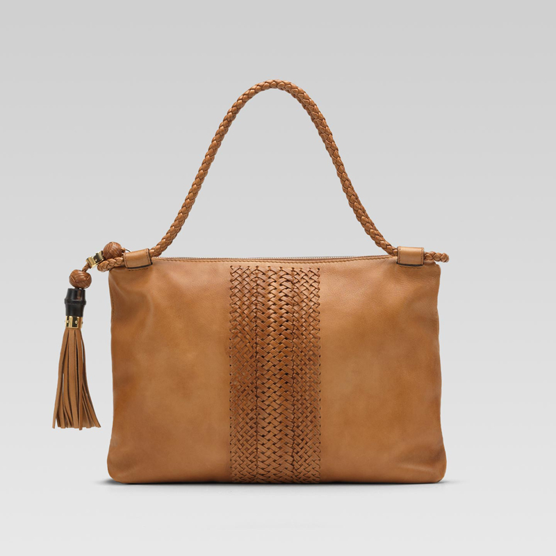 'handmade' medium shoulder bag with woven web detail and tassels with metal G and leather monkey fist details.