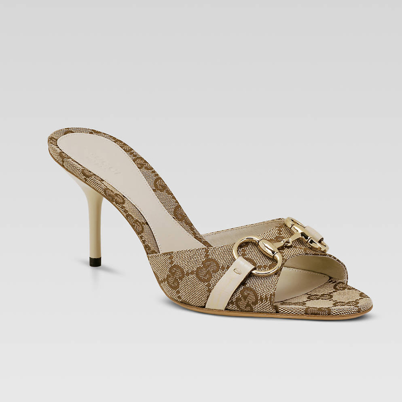 - beige/ebony GG fabric with white leather trim- light gold hardware- leather sole- 3" heel