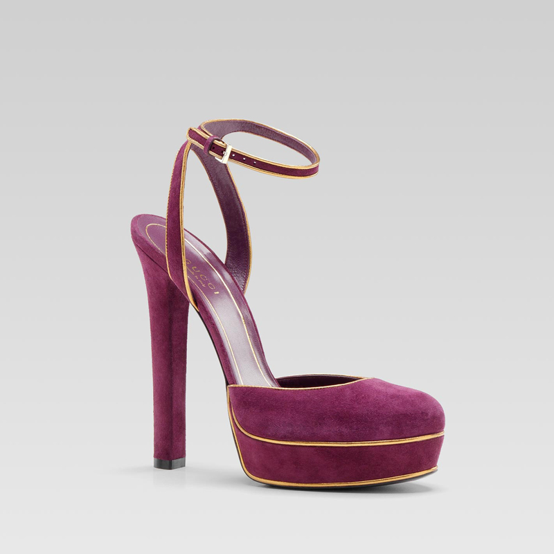 - grape color suede with dark gold leather piping - buckle closure - leather sole - 4.3" heel with a 1" platform