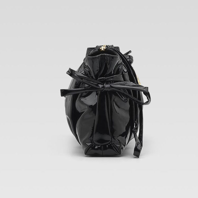 -black patent leather-gold hardware-zip-top closure-inside pocket