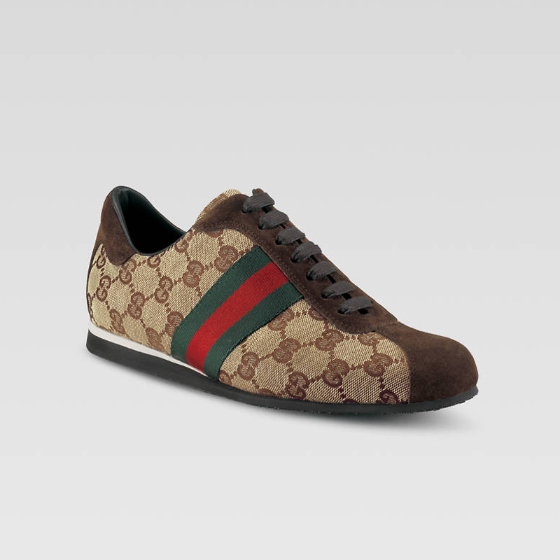 - beige/ebony GG fabric with brown suede trim and green/red/green web- rubber sole