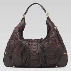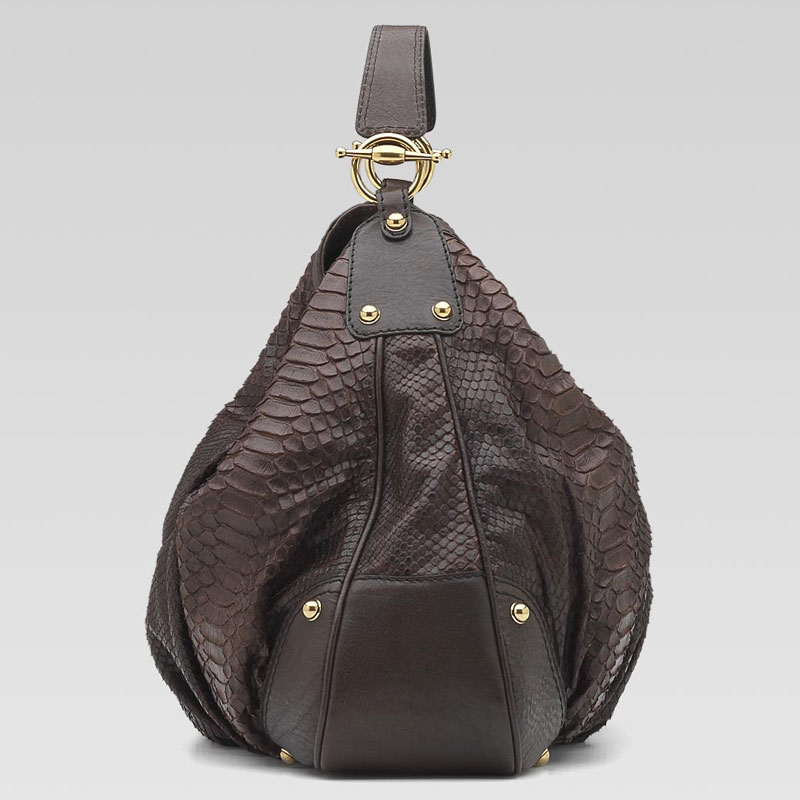 -brown python with brown leather trim-brass hardware-single non-adjustable strap with 10.7" drop-inside zip and cell phone pockets
