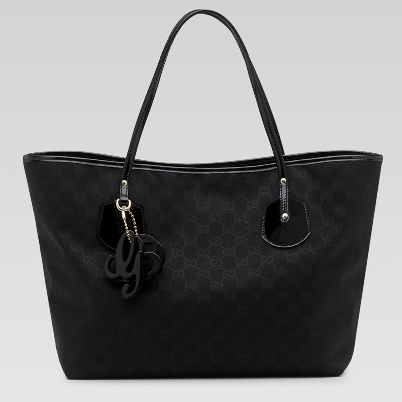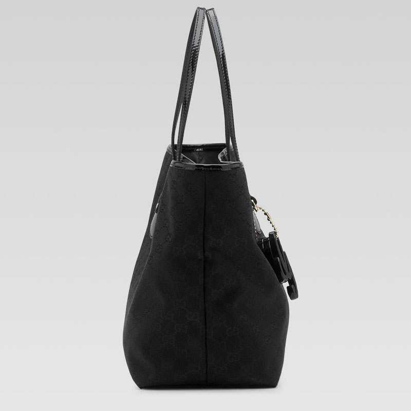 -black GG fabric with black patent leather trim-black plexiglass charms and light gold hardware-double straps-inside zip and cell phone pockets