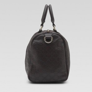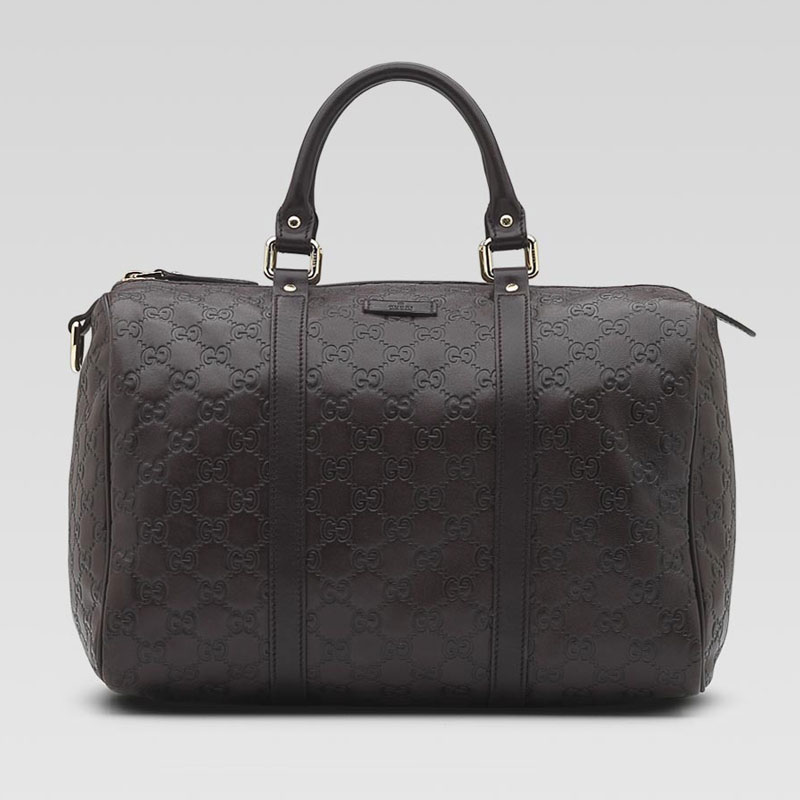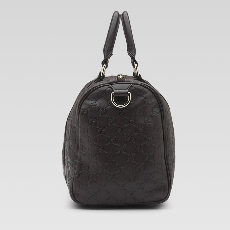 -chocolate guccissima leather with chocolate leather trim-light gold hardware-double handles with 4.3" drop-zip-top closure-inside pocket