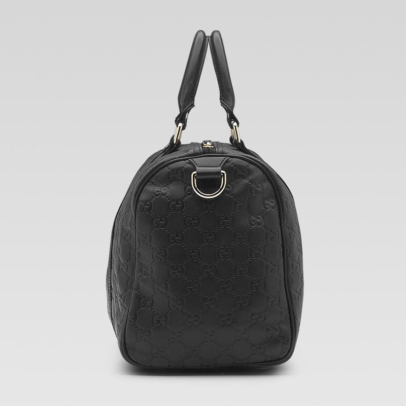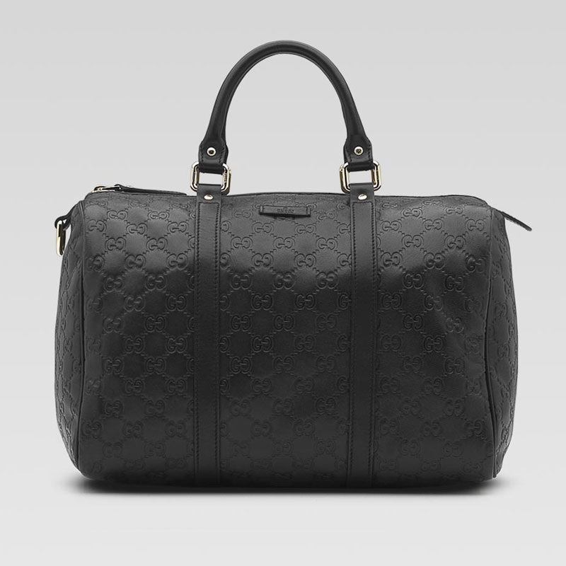 -black guccissima leather with black leather trim-light gold hardware-double handles with 4.3" drop-zip-top closure-inside pocket