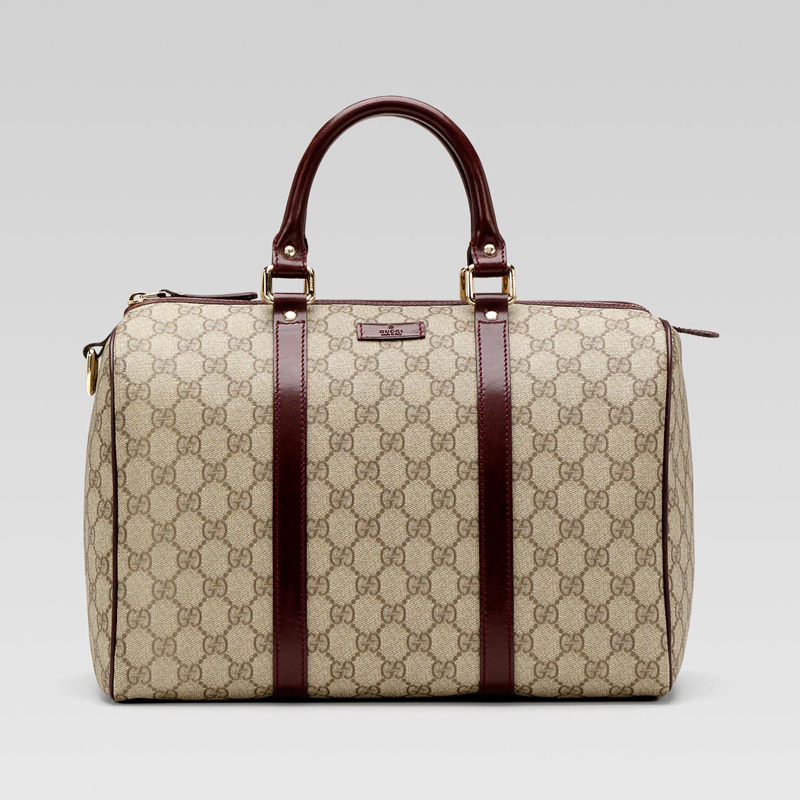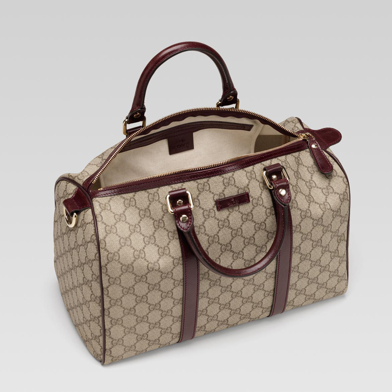 - website exclusive - beige/ebony GG plus with bordeaux leather trim - light gold hardware - double handles with 5.1" drop - zip-top closure - inside pocket