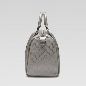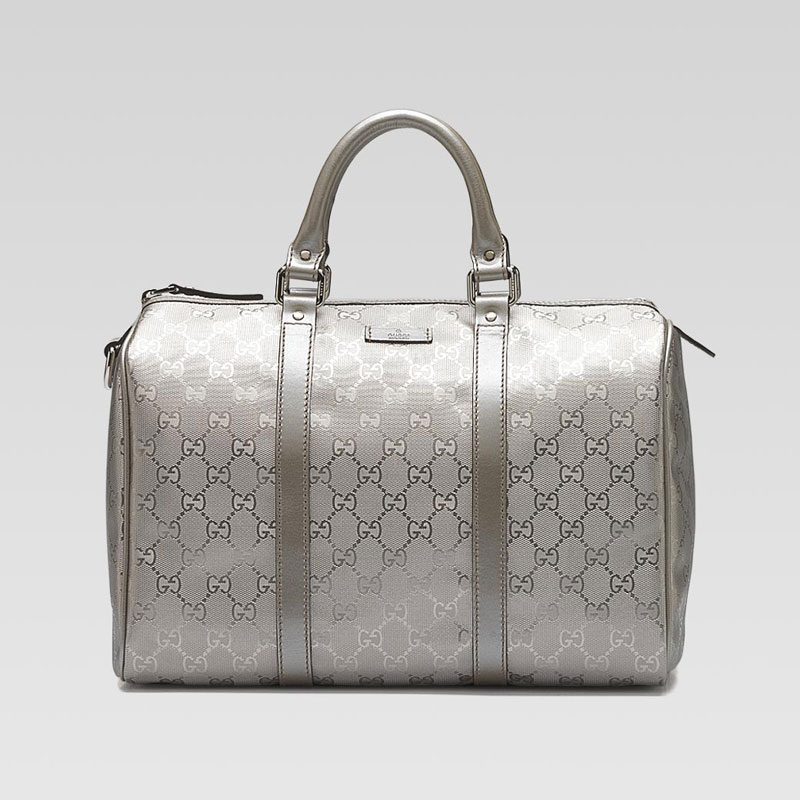-silver GG coated fabric with silver leather trim-nickel hardware-double handles with 4.3" drop-zip-top closure-inside pocket