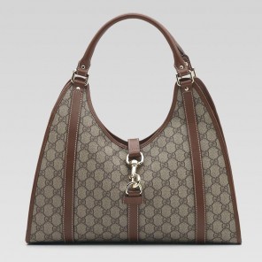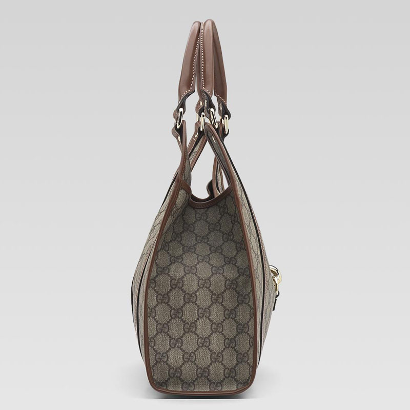 -beige/ebony GG plus with light brown leather trim-light gold hardware-double straps with 7.9" drop-push lock closure-inside pocket