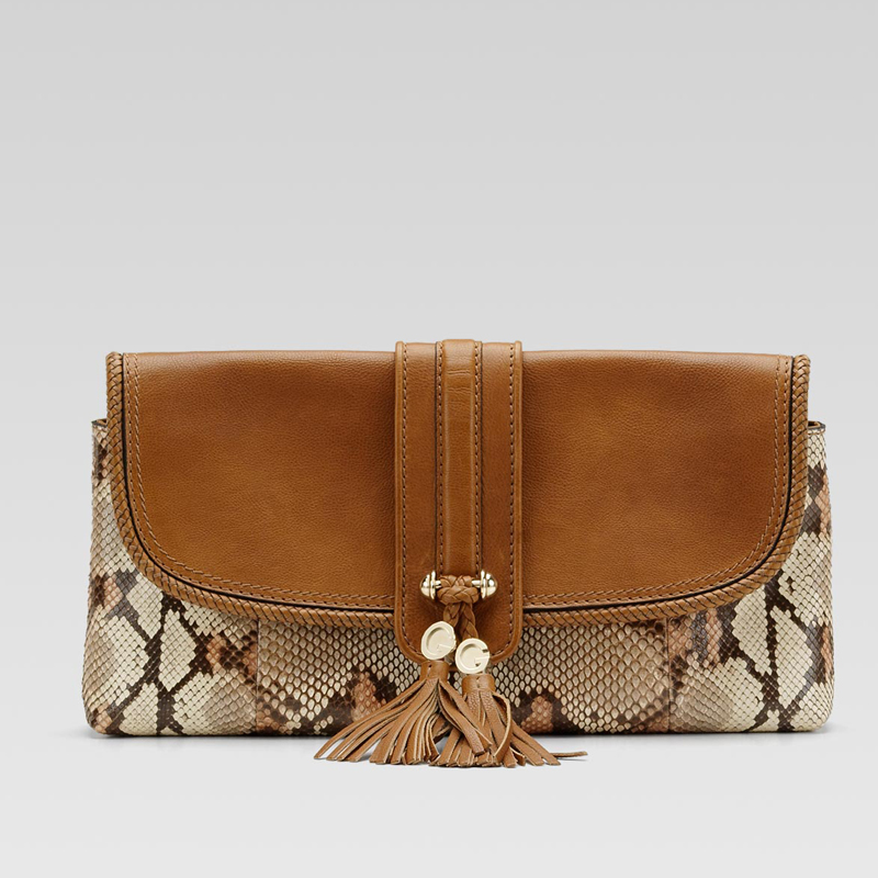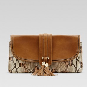 'marrakech' clutch with woven leather trim and tassels with metal G details.