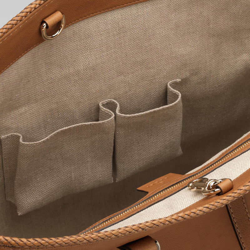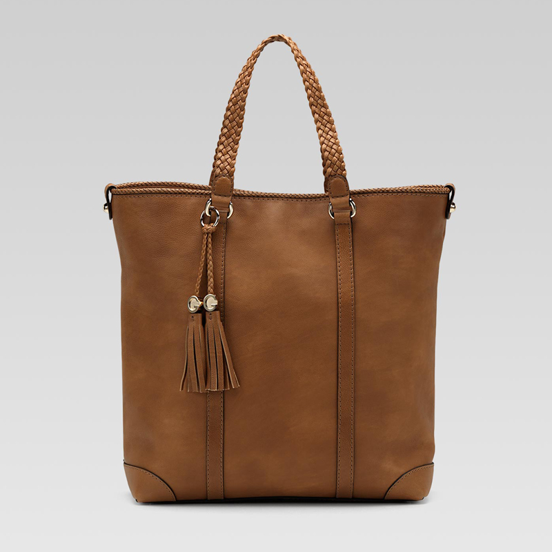 'marrakech' medium tote with woven leather trim and tassels with metal G details.