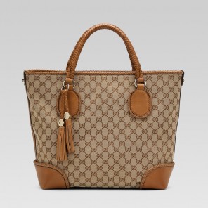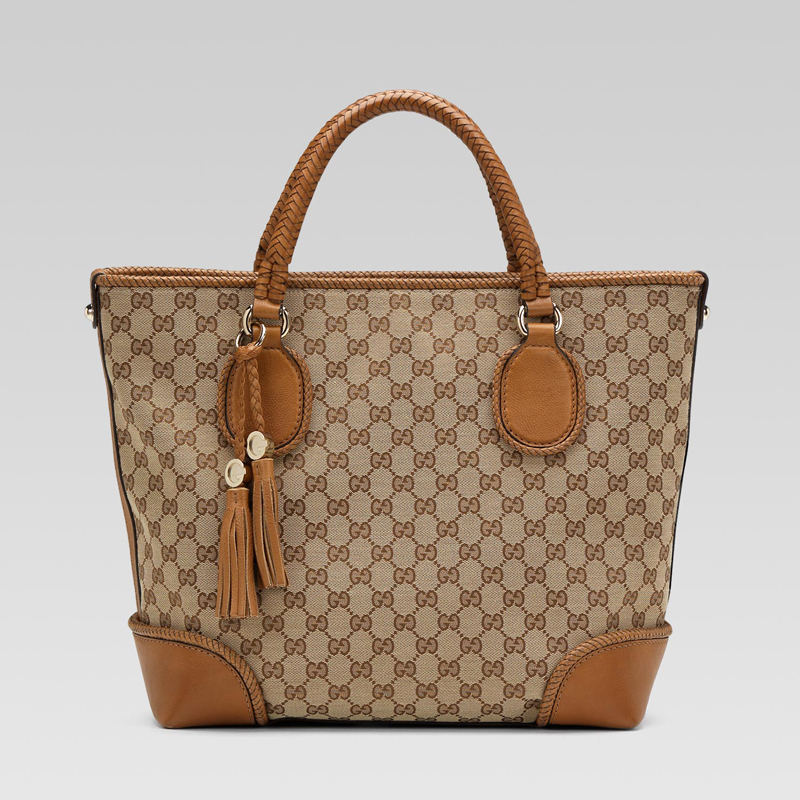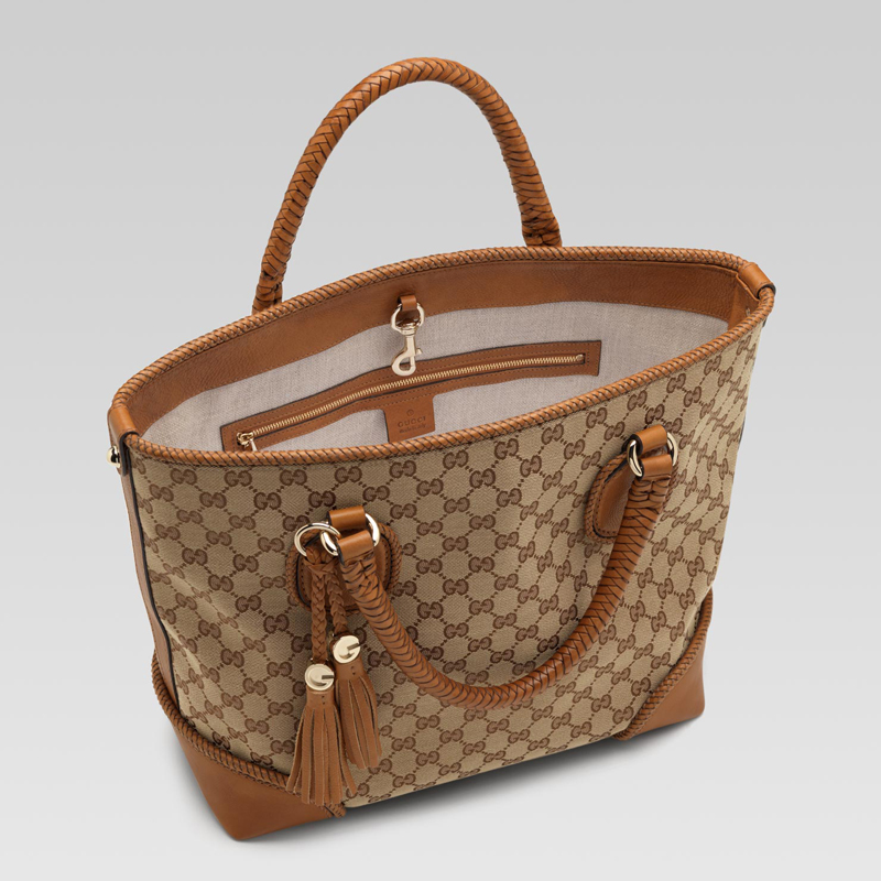 'marrakech' medium tote with woven leather trim and tassels with metal G details.