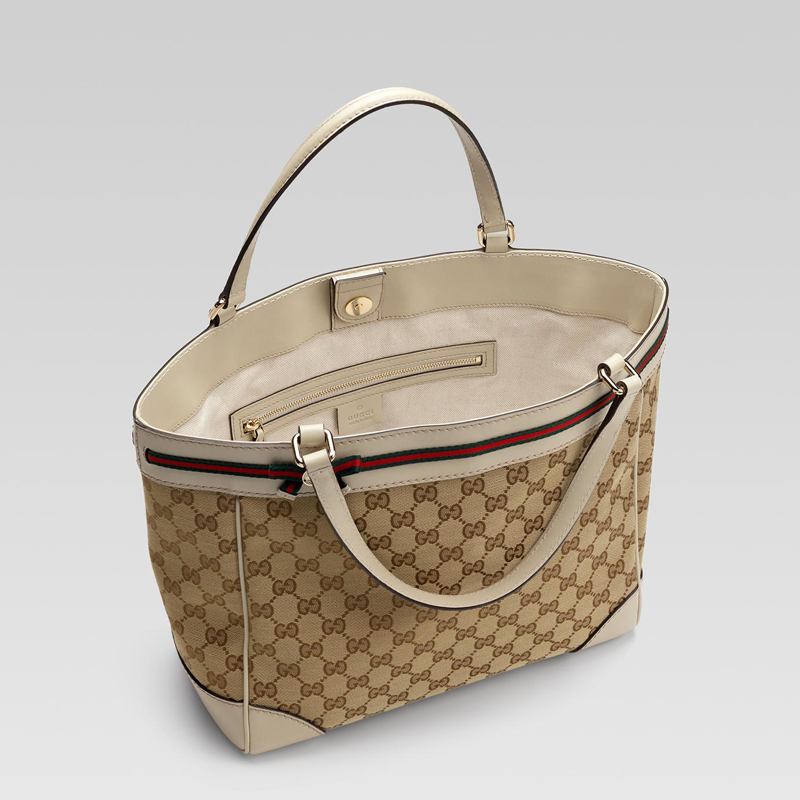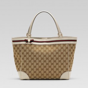 - beige/ebony GG fabric with off-white leather trim and green/red/green signature web